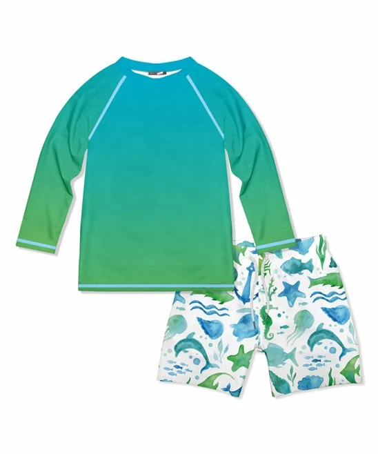 - Includes blue and green ombré long-sleeve rashguard and white and blue watercolor sea creatures swim trunks (two pieces total)