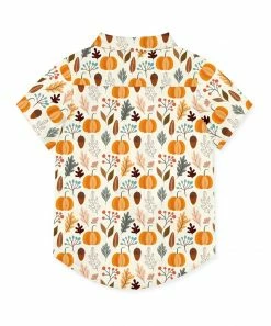 This stretch-blend button-up shows off an adorable pumpkin graphic and sun-ready short sleeves.