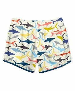 These swim shorties are highlighted by a multicolor shark print.