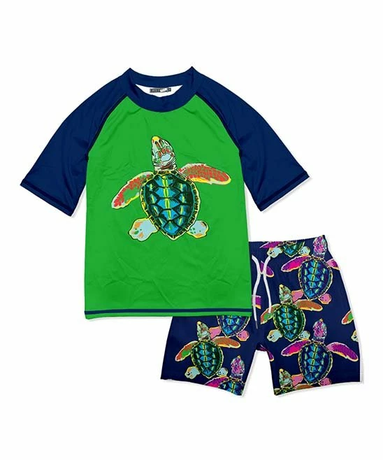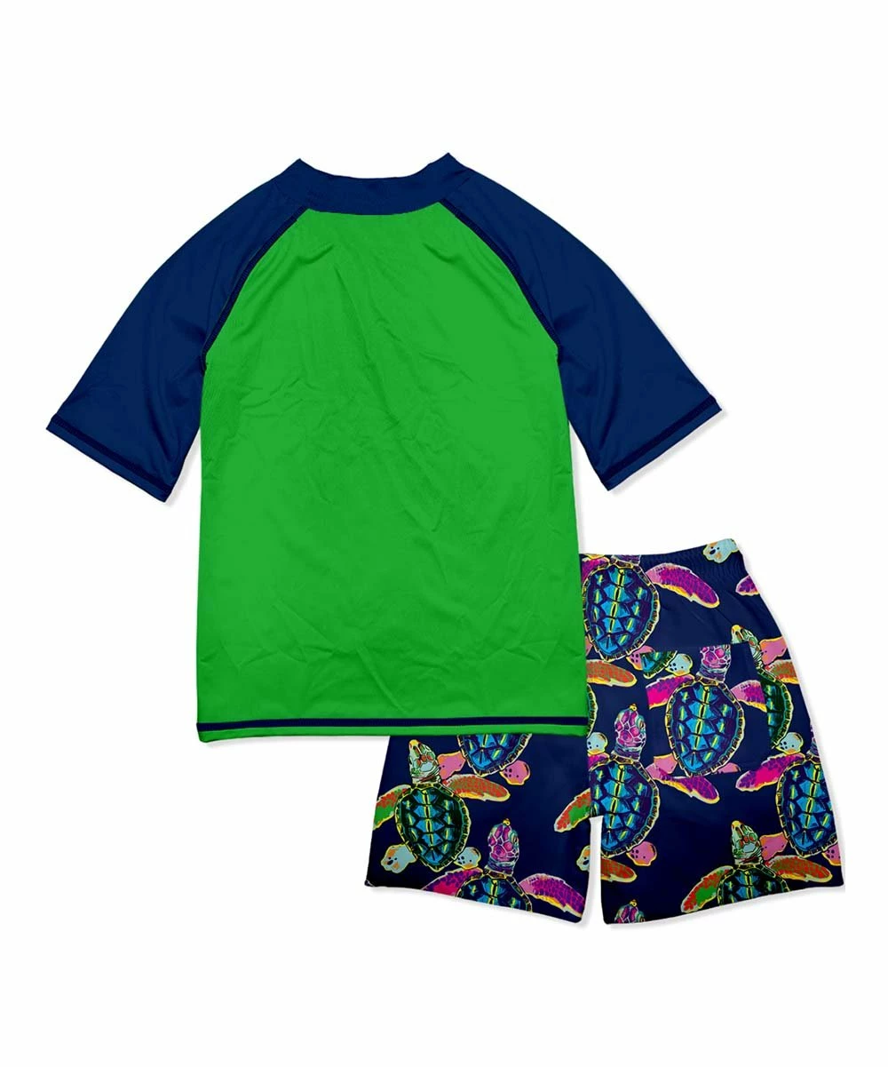 - Includes green and navy turtle rashguard top and navy turtle swim trunks (two pieces total)