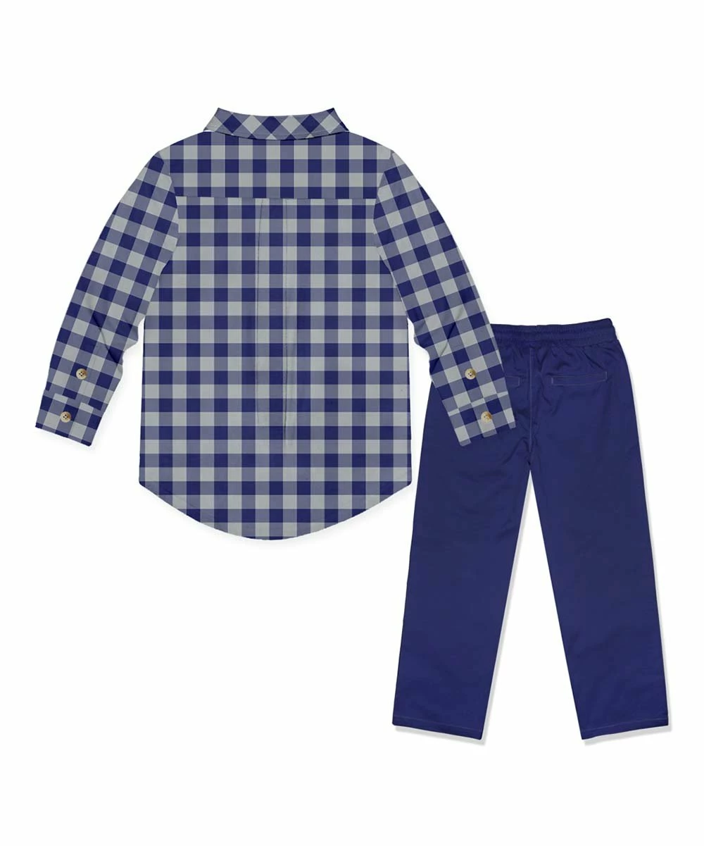 - Includes navy and green gingham button-up and navy pants (two pieces total)