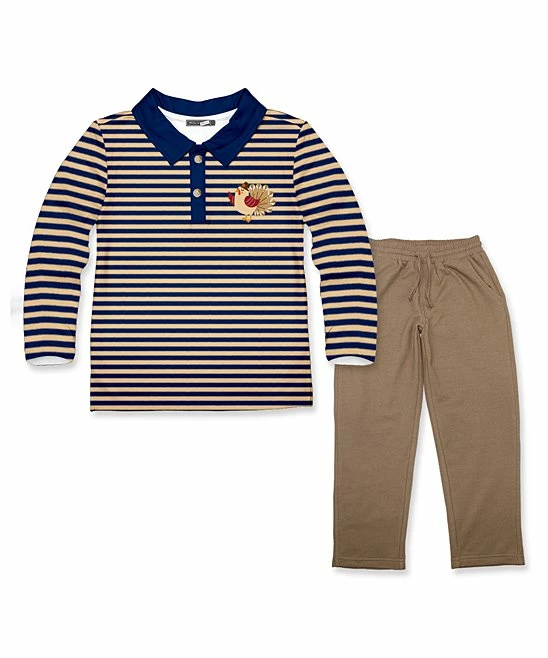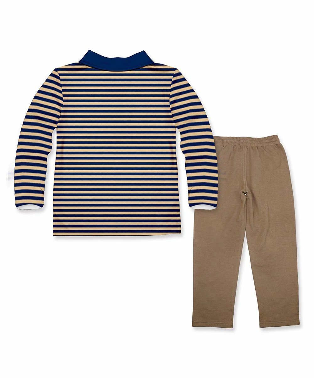 - Includes navy stripe long-sleeve henley and tan pants (two pieces total)