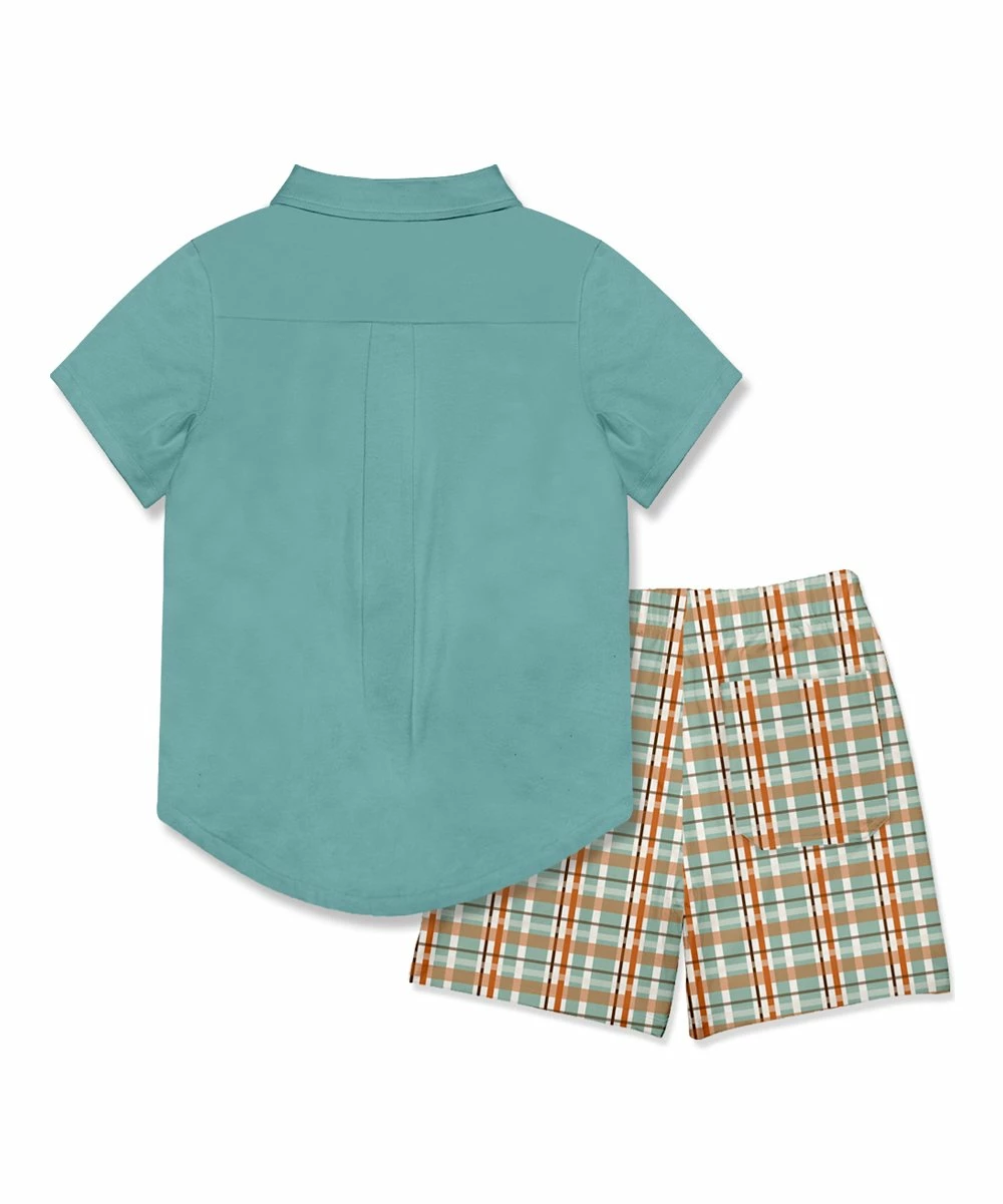 - Includes nile blue short-sleeve button-up and orange and nile blue plaid shorts (two pieces total)