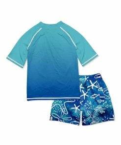 - Includes blue ombré rashguard top and blue fish swim trunks (two pieces total)