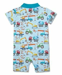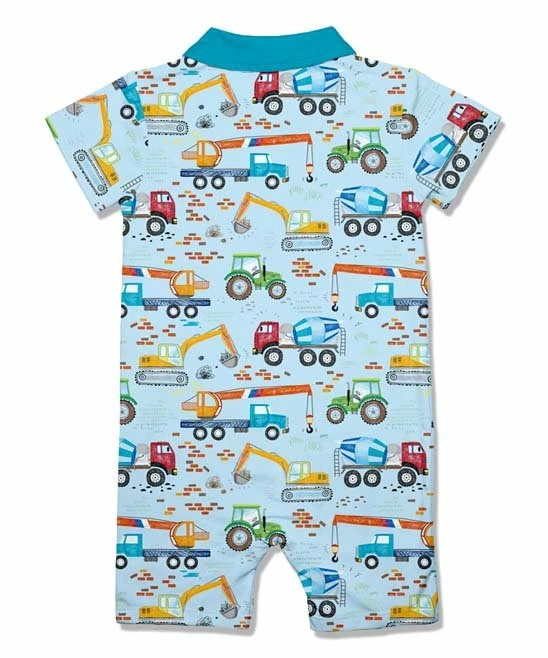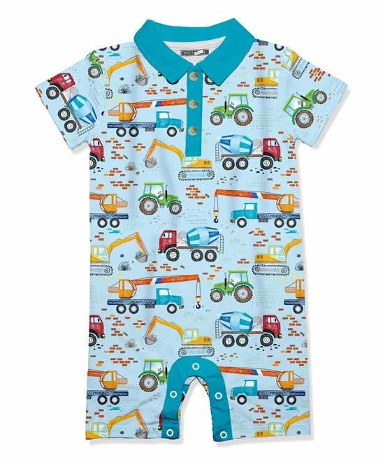 Short sleeves and a snappy collar lend style-right flair to this stretch-enhanced romper boasting snaps at the bottom for quick changes.