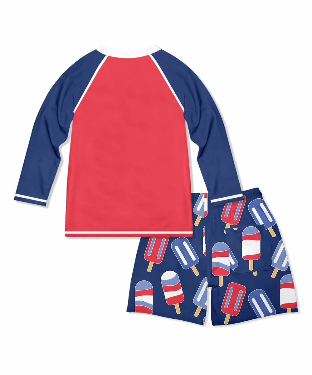 - Includes red and navy long-sleeve rashguard and red and navy popsicle swim trunks (two pieces total)